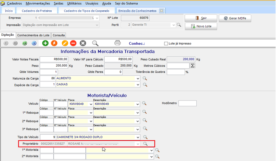 Em EXP > Movimentações > Emissão > Conhecimento, após realizar a configuração do Freteiro, deve ser verificado o conhecimento e Motorista/Veículo adicionado.