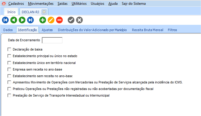 No arquivo gerado no registro 0001 e 9999 serão exportados os dados de abertura e fechamento da declaração. Na guia Identificação, deverão ser marcados ou não as opções para identificação da declaração e a data de encerramento.