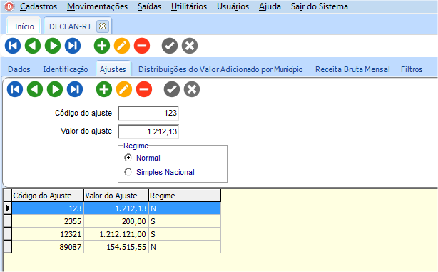 Na guia Ajustes, serão cadastrados os ajustes para declaração informando o código e valor do ajuste, informar o regime.