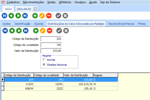 No registro 0300 do arquivo serão exportados esses ajustes cadastrados. Na guia “Distribuições do Valor Adicionado por Município”, devera ser informado o código da distribuição, código da localidade e o valor da distribuição, além do regime das distribuições.