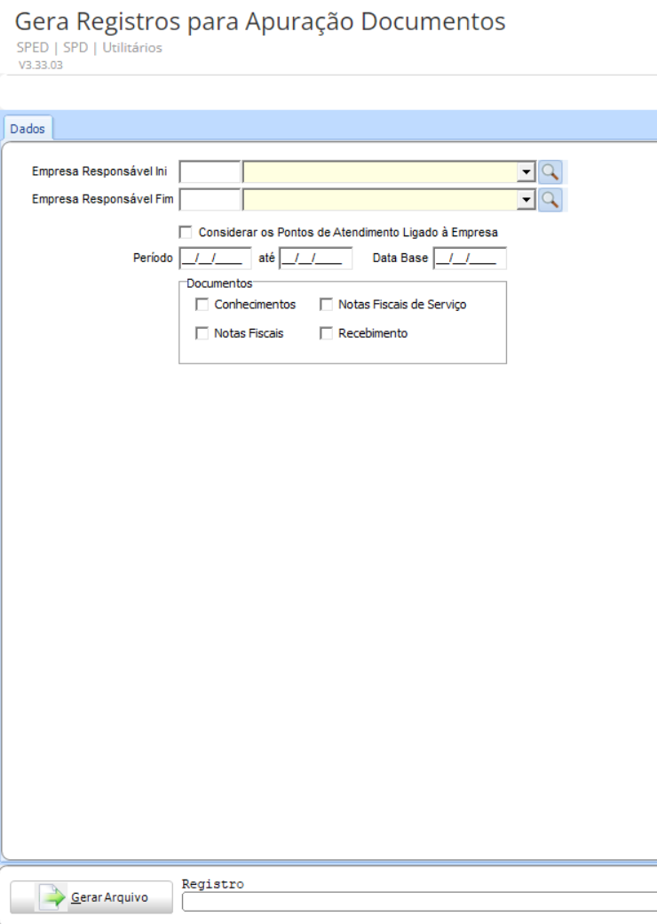 Após definir os filtros, clique em Gerar Arquivo, no rodapé da tela. Os documentos selecionados serão então gravados nas tabelas de Performance.