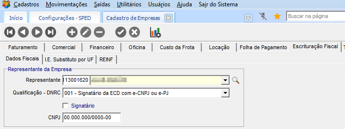 Na guia Escrituração Fiscal > Dados Fiscais, o representante da empresa deve ser informado: