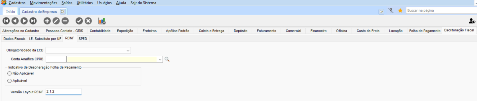 Na guia Escrituração Fiscal > REINF, todos os campos da guia devem ser preenchidos: