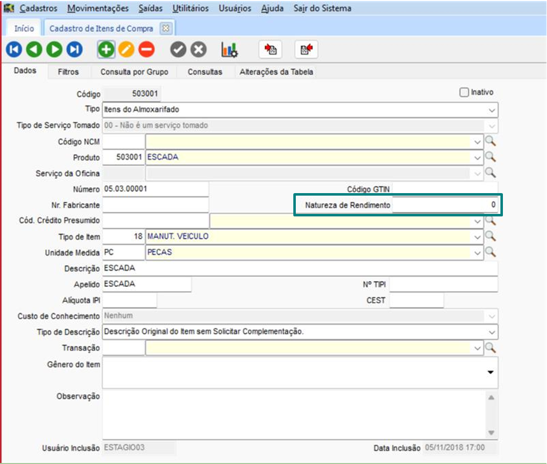 - No módulo SUP em Cadastros > Compras > Itens da Compra, é necessário definir a natureza de rendimento do item da compra. Após configurado o código do item de compra, esse é apresentado, somente para fins de histórico, na guia Natureza de Rendimento na movimentação do item da Nota de Recebimento.