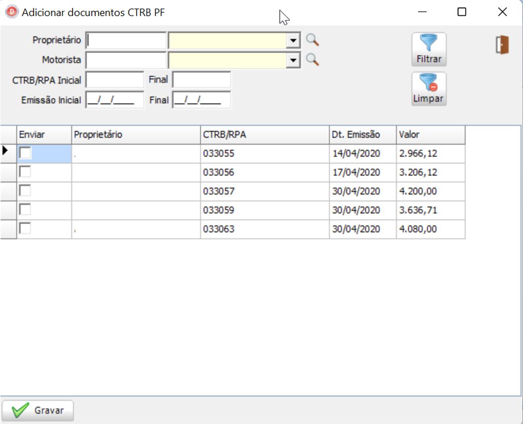 Selecione quais Carta Frete serão enviadas para o registro através das caixas de seleção, clique em Gravar e saia da tela.