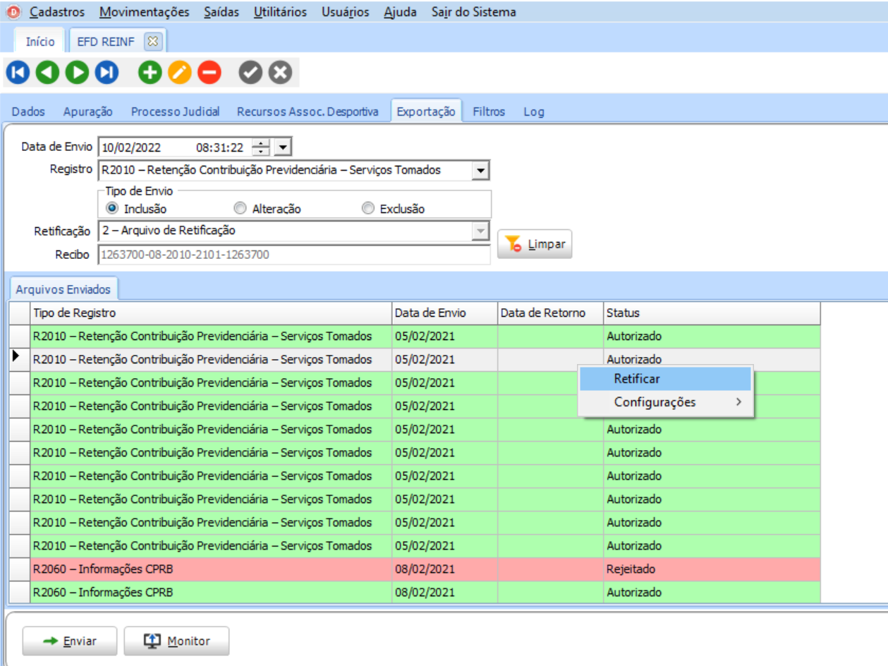 Em SPD > Movimentações > EFD REINF, na guia Exportação no registro que deseja retificar, deve-se clicar com o botão direito do mouse e em seguida clicar na opção Retificar.