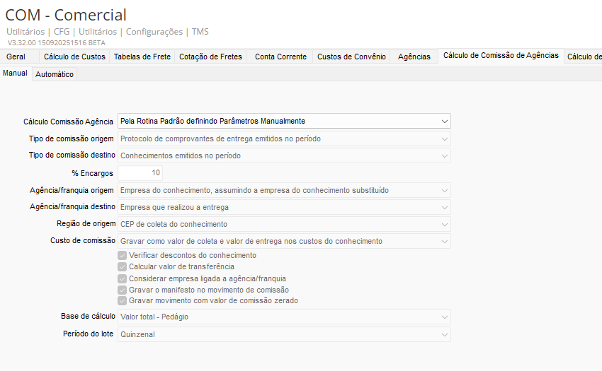 Na guia Manual, é possível configurar o Cálculo Comissão Agência por diferentes opções: