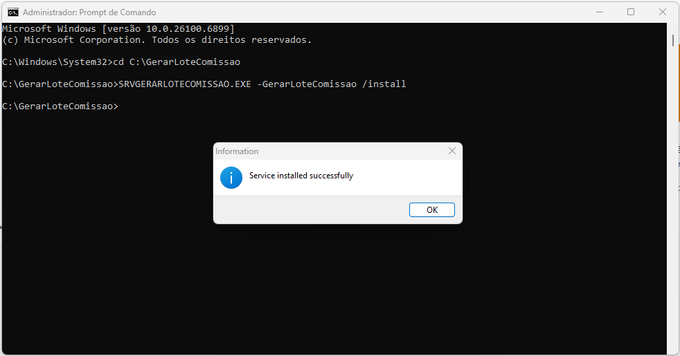 C:\GerarLoteComissao> SRVGERARLOTECOMISSAO.EXE -GerarLoteComissao /install
