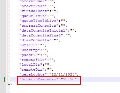 No arquivo .JSON, existe uma tag chamada "horarioExecucao", que define o horário de execução do serviço. O serviço será executado uma vez por dia no horário configurado.