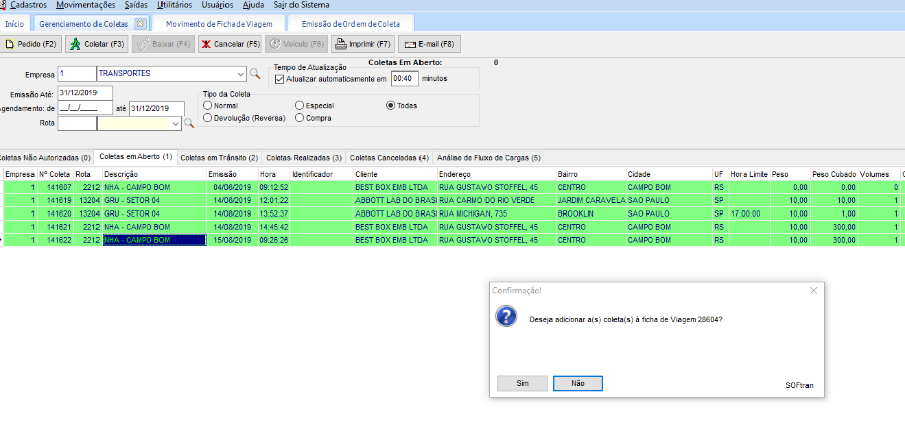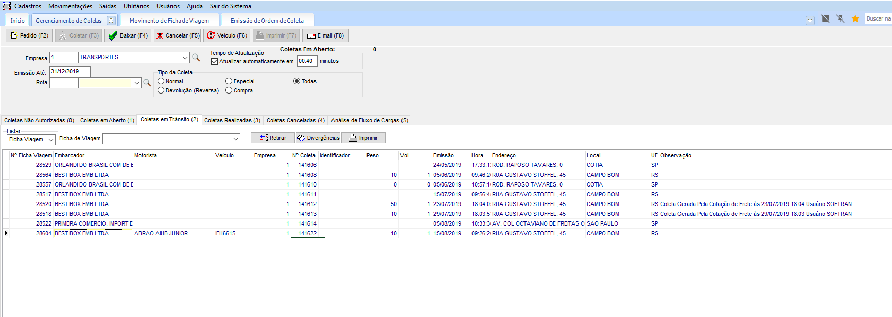 Na tela do gerenciador de coletas, ao efetuar duplo clique, ou pelo botão Coletar (F3), o sistema gera a ficha de viagem automaticamente, sem questionar o usuário deste processo.