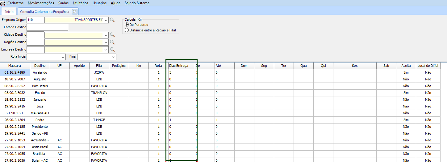 Na rotina de consulta de Caderno de Frequência é possível habilitar e desabilitar a coluna Dias de Entrega Região. Para que somente a área comercial e operacional tenham acesso aos prazos das regiões. conforme opção marcada nas configurações o sistema permite substituir a descrição da coluna na tela de Consulta Caderno de Frequência. Essa configuração tem por objetivo controlar o acesso à estas informações, somente para usuários permitidos de acordo com o seu setor.