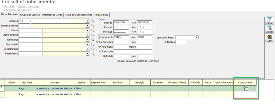Com o módulo atualizado, clique em Saídas > Consultas > Consulta Conhecimento. Na coluna comprovante, quando o CT-e possuir documentos vinculados é apresentado um ícone no grid: