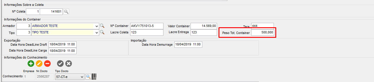 Os campos “Porto Transbordo” e “Peso Total Container” serão definidos no Cadastro de Containers, indicando qual o Porto que fará o transbordo da carga e apresentar o valor do peso total que está no container no módulo CCE, em Movimentações > Controle de Container.