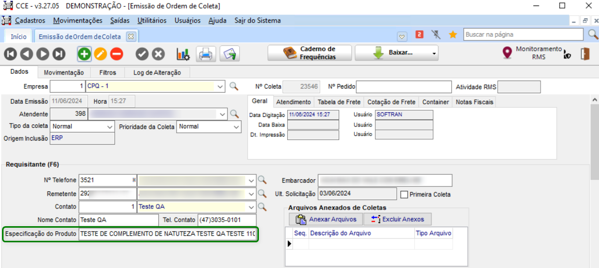 Sim, é possível incluir informações adicionais na ordem de coleta através do campo Especificação do Produto localizado na guia Dados, no quadro Requisitante (F6).