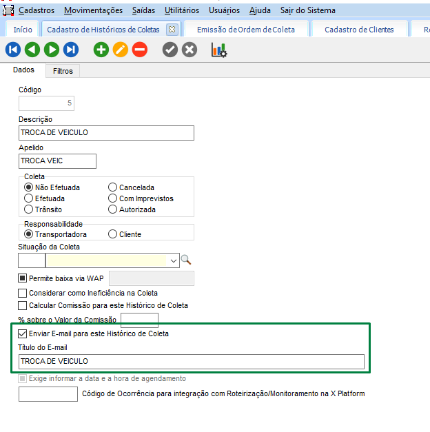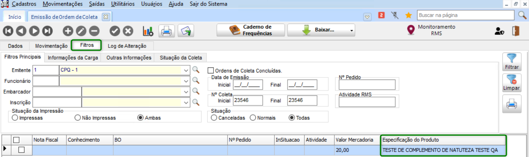 Na tela de Ordem de Coleta, na guia Movimentações, ter diferentes situações cadastradas, ou ter a coleta com a situação de “Baixada” ao qual já foi efetuada a entrega.