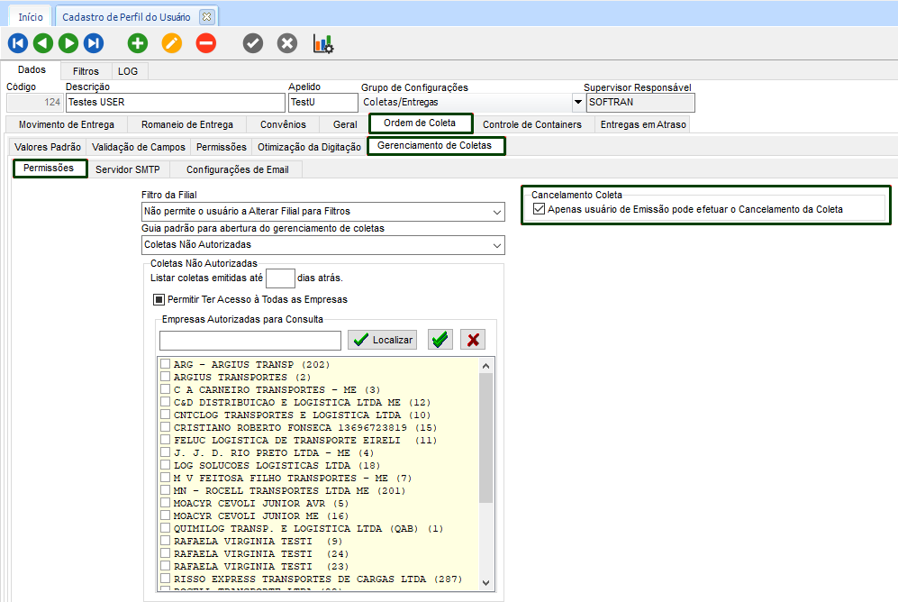 No módulo Utilitários> Configurações> Cadastros> Usuários> Perfil de usuários. Ao cadastrar ou editar, no Grupo de configurações > Coletas/Entregas, na guia Ordem de coleta > Gerenciamento de Coletas > Permissões é possível habilitar o parâmetro: Apenas usuário de Emissão pode efetuar o Cancelamento da Coleta no grupo de Cancelamento de coleta.