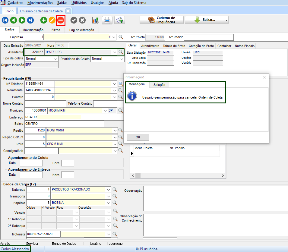 Uma vez habilitada a permissão Apenas usuário de Emissão pode efetuar o Cancelamento da Coleta, os usuários pertencentes ao perfil em questão terão bloqueio ao cancelar coletas de outros usuário em: TMS> Coleta e Entrega> Movimentações> Controle de Coletas> Ordem de Coleta. Ao abrir uma coleta cadastrada por outro usuário e tentar realizar o cancelamento, existirá o seguinte retorno Usuário sem permissão para cancelar Ordem de Coleta.