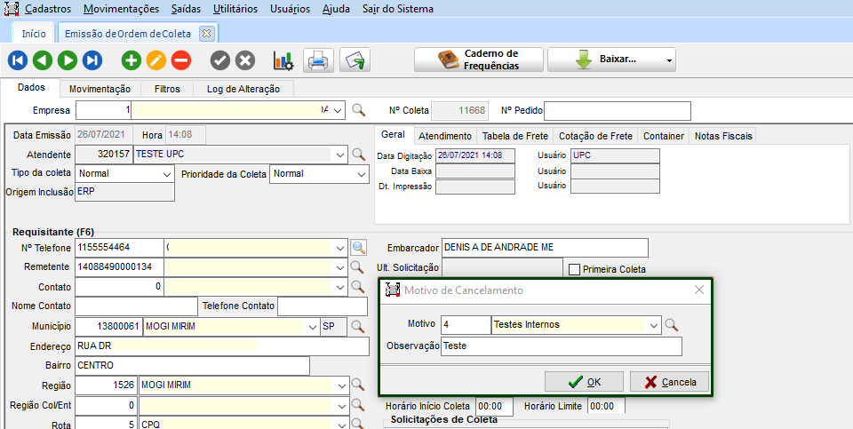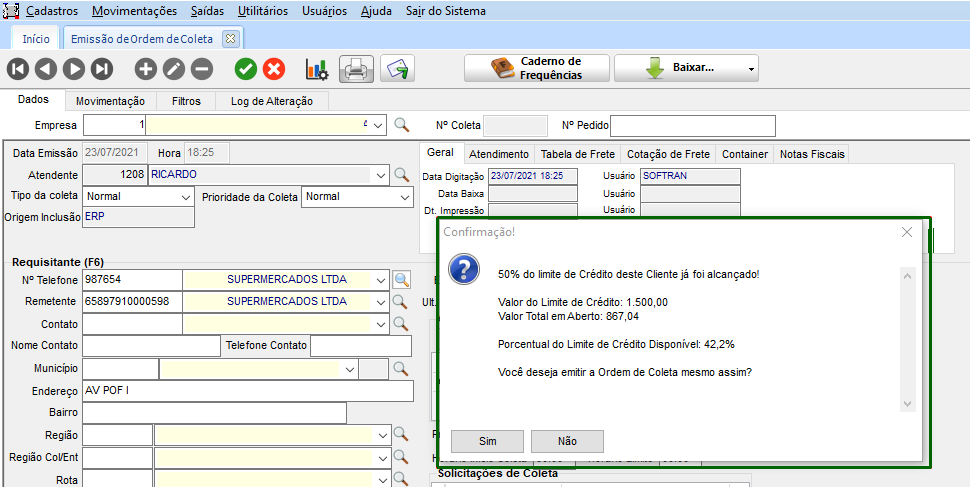 Após realizar a configuração necessária, no módulo CCE, em Movimentações > Controle de Coletas > Ordem de Coleta, de acordo com as configurações do perfil do usuário e negociação com cliente, realizado o cadastro de uma coleta com os mesmos dados. Ao informar o Embarcador, o sistema verifica os valores do limite de crédito e apresenta mensagem para o usuário.
