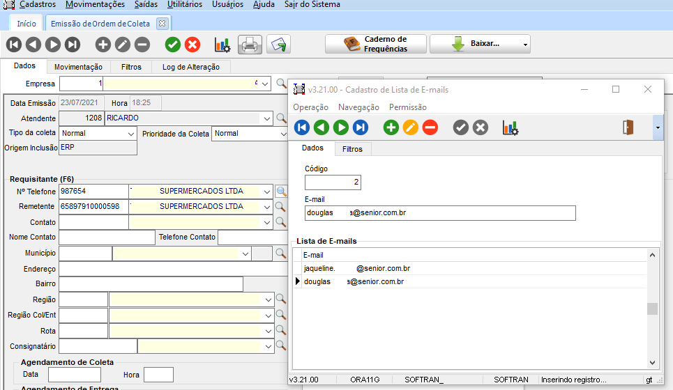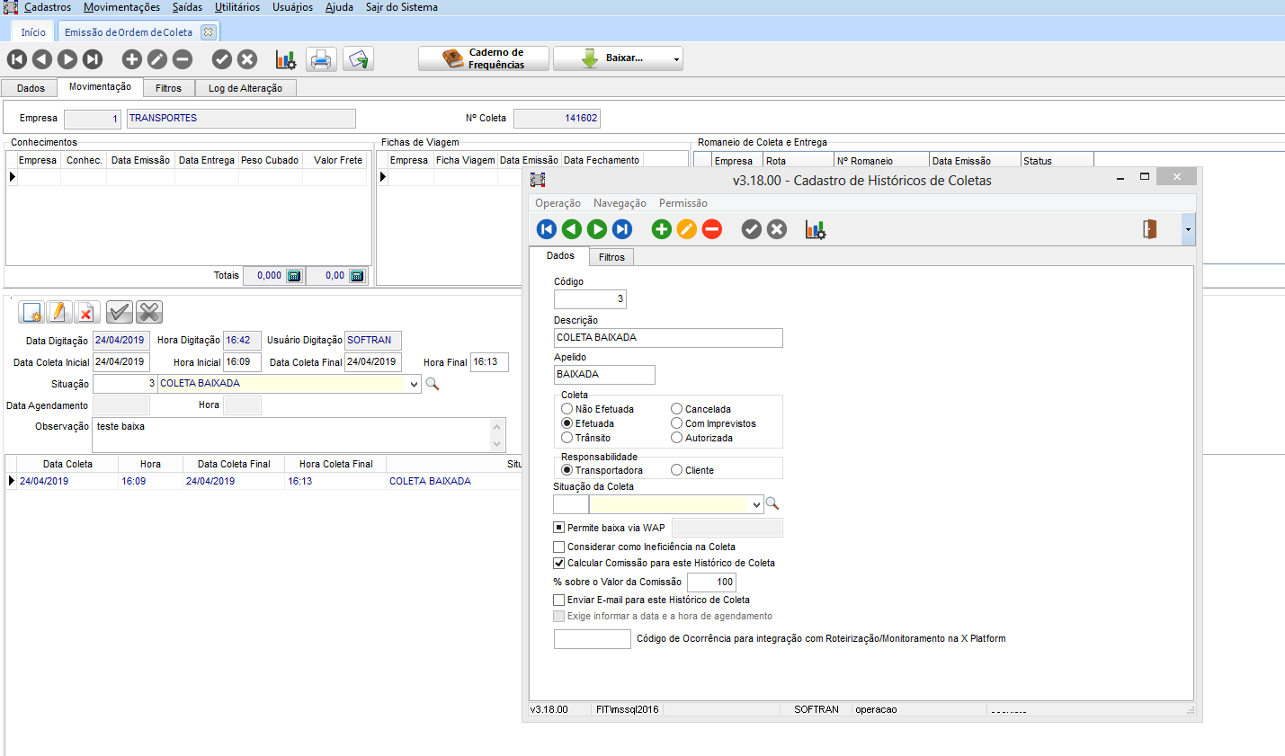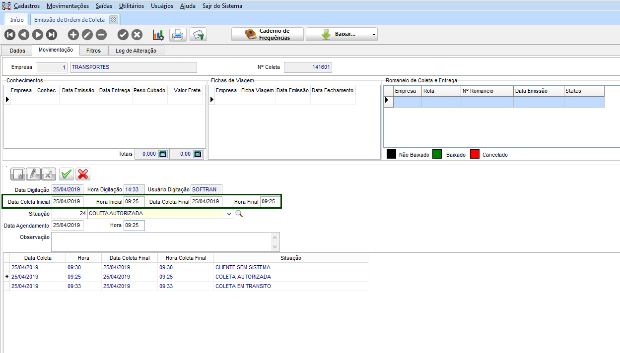 Na coleta que registra o romaneio atual (nr. 24), na guia Movimentação, apresenta os históricos (conforme o que foi configurado no CFG) bem como o cancelamento do romaneio anterior com a mudança para o romaneio atual.