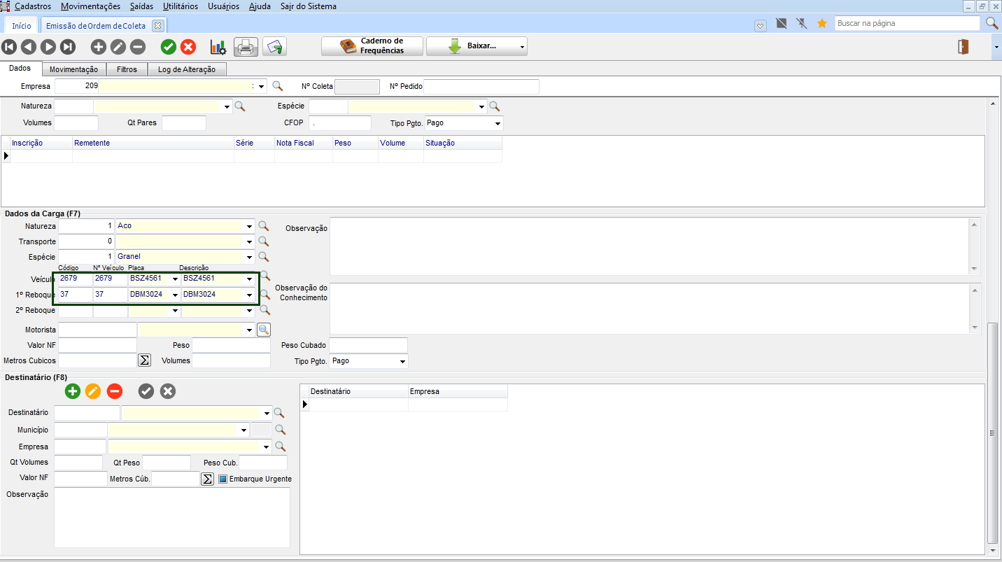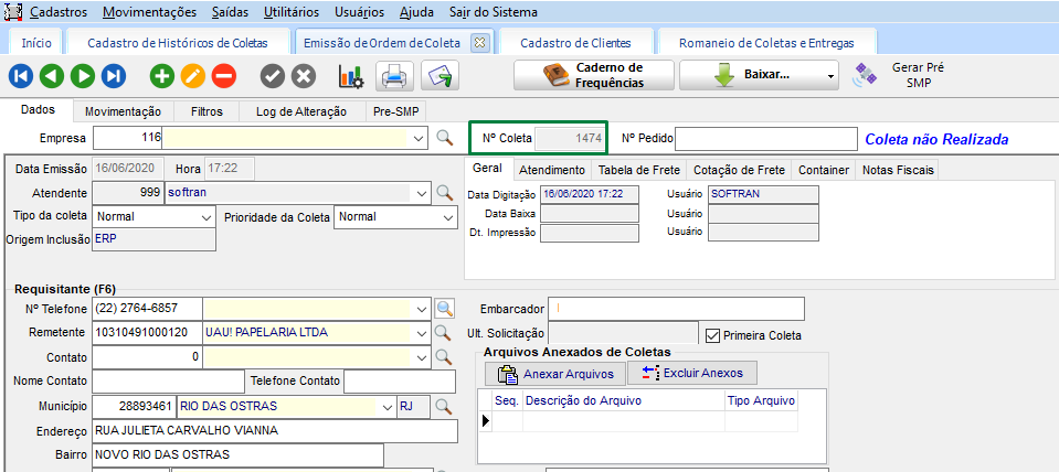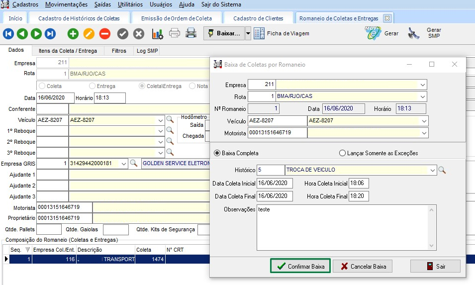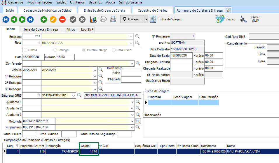 Na guia Coletas, incluído o campo Mudança de Romaneio, buscando os dados do Cadastro de Histórico de Coletas: