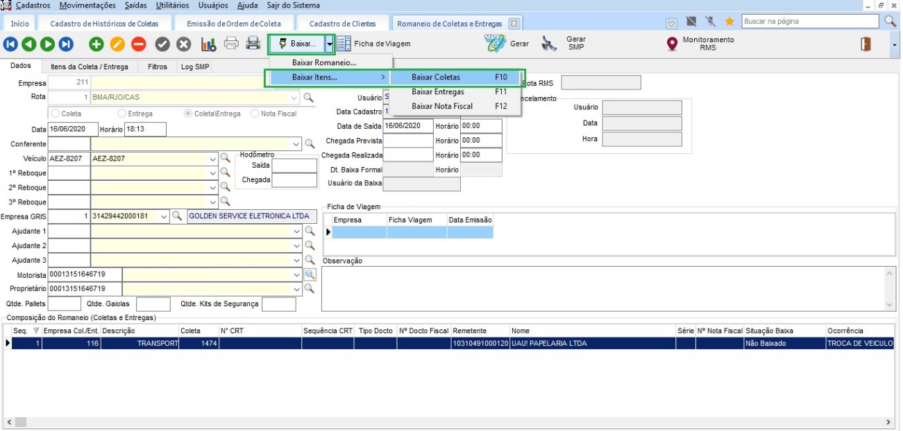 Após realizado as configurações, na coleta, utilizamos a coleta 10 como exemplo, ao ser criado um romaneio e adicionado a mesma coleta na guia de Itens de coleta/entrega.
