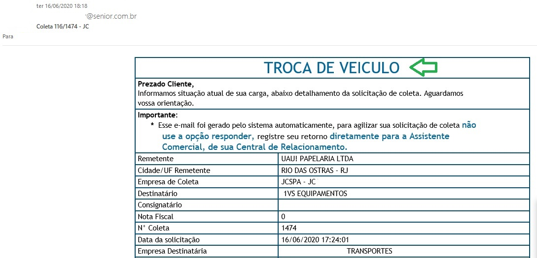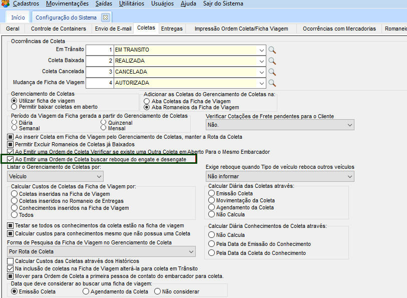 Esta opção, possibilita automatização da troca de veiculo de uma Coleta, para que ao inclui-la em algum novo romaneio, seja lançada uma ocorrência de mudança.