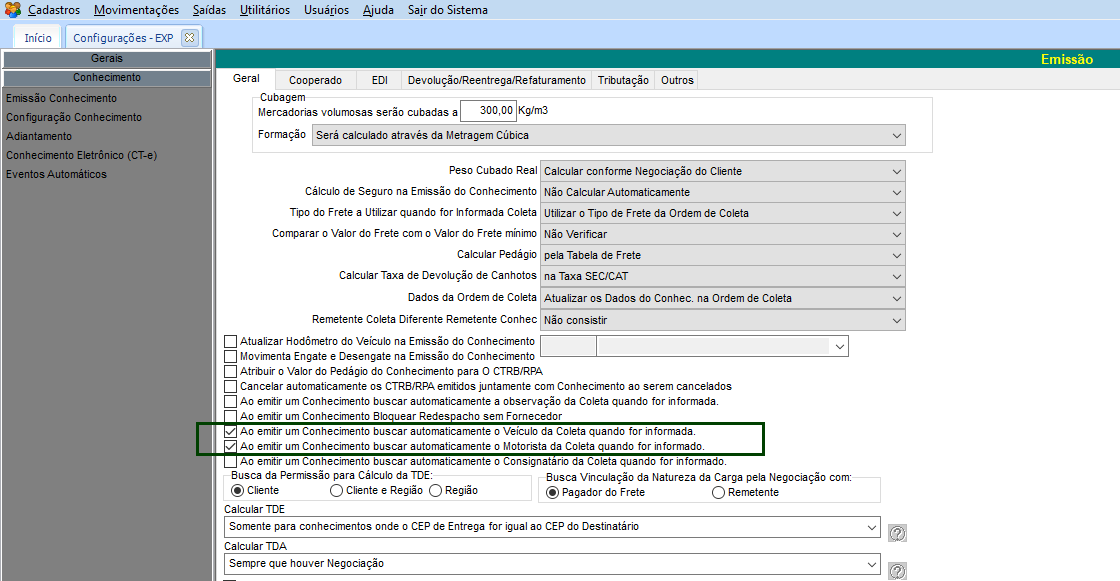 Ainda no CFG em Utilitários > Configurações > TMS > EXP - Expedição> Conhecimentos > Emissão Conhecimento na guia Geral,marque as opções: