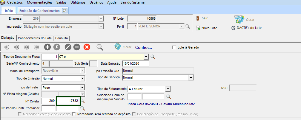 No modulo EXP em Movimentações >Conhecimentos >Emissão, ao informar o número da coleta e sair do campo, se a opção estiver marcada ele busca o reboque e os dados do motorista e placas informadas.