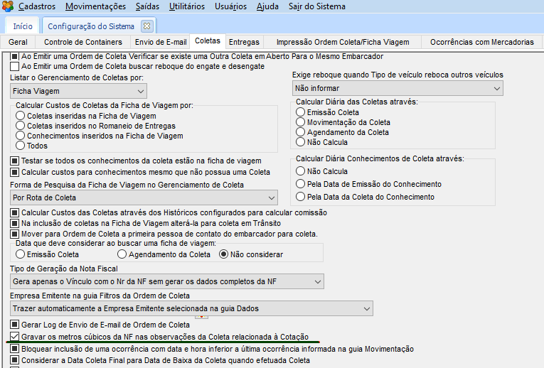 Nas configurações gerais do módulo CCE, marcar a configuração para gravar a informação dos metros cúbicos da NF nas observações da Coleta relacionada a Cotação.