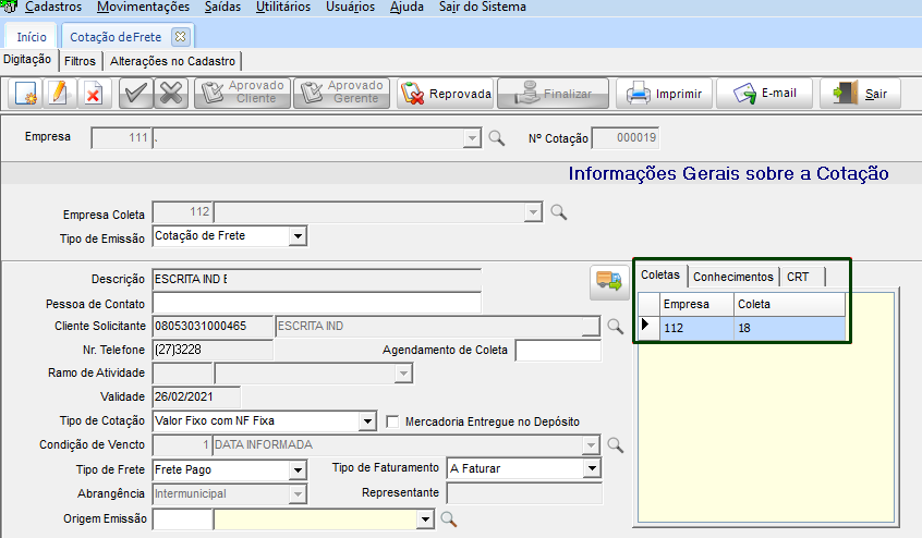 Com a configuração marcada, acesse o módulo COM em Movimentações > Cotação de Frete. Quando realizar a Aprovação pelo gerente, o sistema emite a mensagem se deseja criar uma coleta através da cotação. Ao confirmar o processo, a coleta é criada de acordo com os dados da cotação.