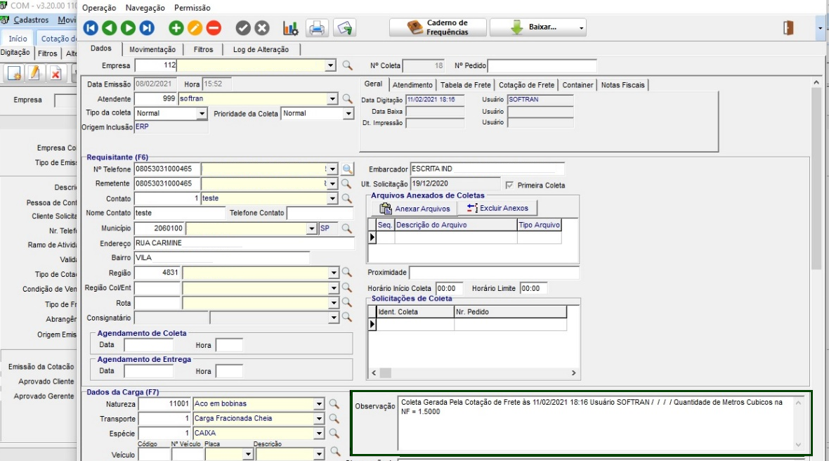 Ao verificar o campo Observação da coleta, o sistema apresenta a informação da quantidade de metros cúbicos informada na cotação.
