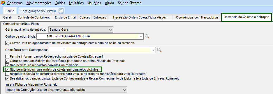 - Ocorrência de Entrega de Remoção do Romaneio Origem: conforme configurado em um cadastro Geral;