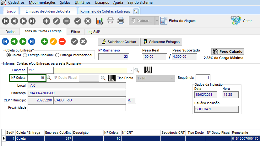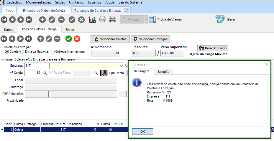 Em Movimentações > Romaneio de Coletas e Entregas, cadastrado um novo registro, adicionando a mesma coleta.