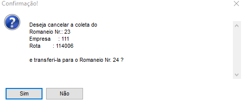 Ao clicar em OK, o sistema emite a mensagem se o usuário deseja cancelar o romaneio anterior e deseja transferir a coleta para o novo romaneio.