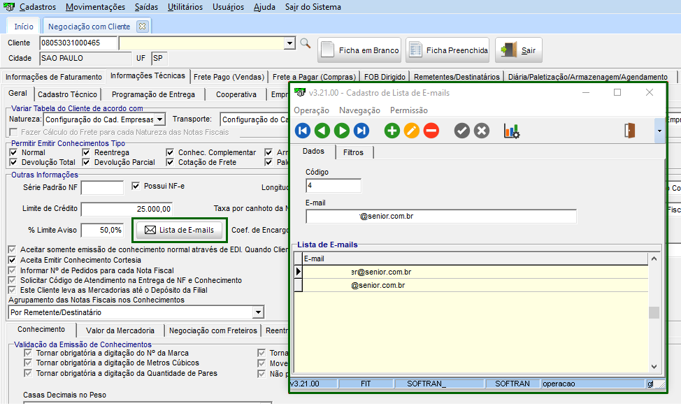 - o botão Lista de E-mails, que para cada cliente quando for selecionado na tela de Negociação, seja permitido cadastrar uma listagem de e-mails que irão receber o e-mail de aviso de crédito, quando realizado pela tela de Emissão de CTe e Ordem de Coleta