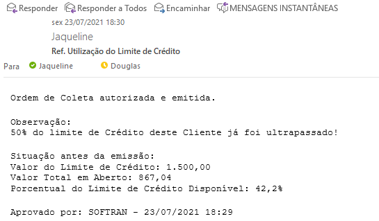 Caso tenha, será enviado um e-mail automaticamente para esta lista, com as mesmas informações citadas na mensagem sobre o aviso de limite de credito.