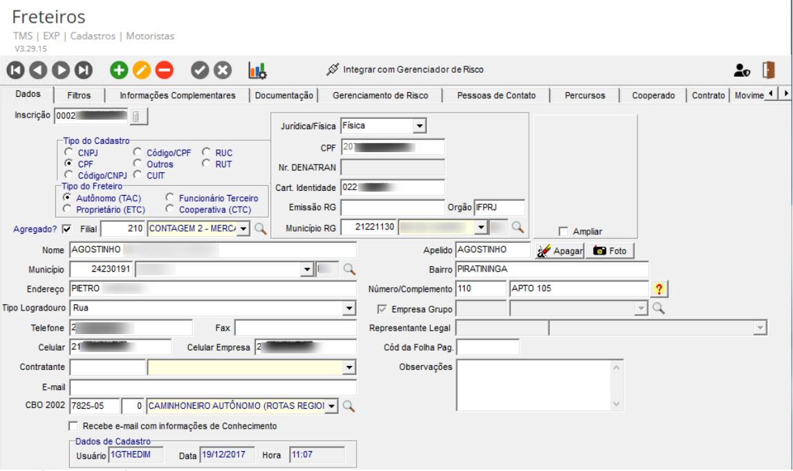 Para integrar um cadastro de Freteiro utilize o Botão: Integrar com Gerenciadora de Risco.