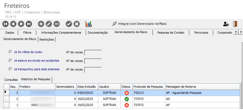 Após integrado o Cadastro do Freteiro, acesse a guia Gerenciamento de Risco e clique no botão Pesquisa/Consulta.
