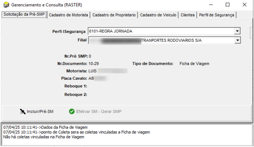 Após fazer o cadastro da Ficha de Viagem com todos os dados como Romaneio, Notas fiscais , Manifestos, ao clicar em Gerar Solicitação de SMP será exibida a tela de Gerenciamento e Consulta (Raster).