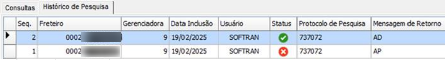 - Na guia Histórico de Pesquisa, ficará gravado as consultas que estão em andamento ou que tiverem alguma rejeição.