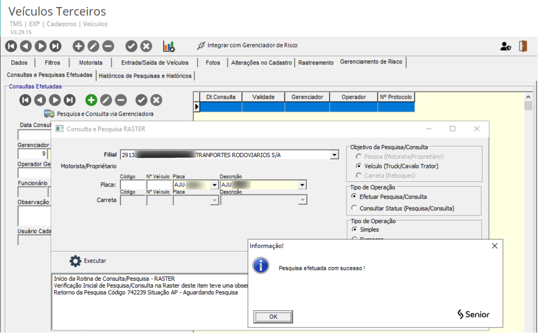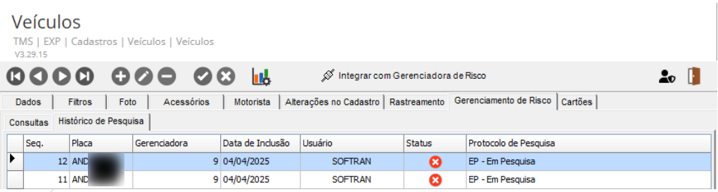 - Com veículo integrado, acesse a guia Gerenciamento de Risco e clique no botão Pesquisa e Consulta via Gerenciadora.