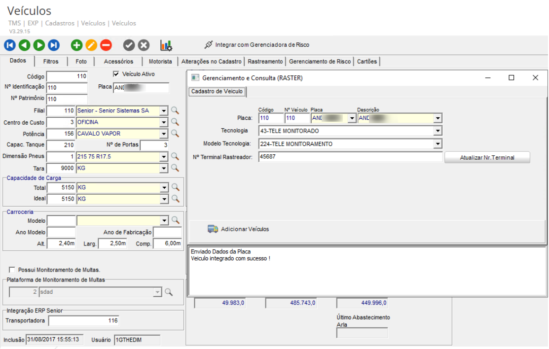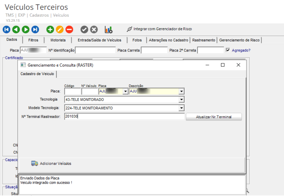 - Na tela de Gerenciamento e Consulta (RASTER) informe a Tecnologia e n° Terminal Rastreador.