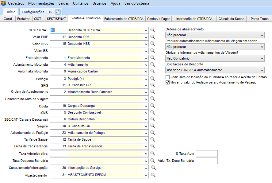 No módulo FTR no menu Cadastros > Cadastros Gerais > Operadoras de Pagamento Eletrônico CTRB/RPA, na guia Geração CIOT da operadora de pagamento Repom,na guia Geral, configure os campos Gera Interrupção de Serviço, Portador e Conta Corrente.