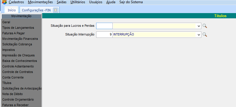 No módulo CFG no menu Utilitários > Configurações > Financeiro > FIN - Financeiro > Títulos, configurar o campo Situação Interrupção.