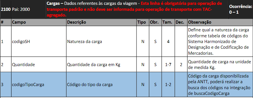 Para operações Padrão na linha 2100 criado o campo código do tipo da carga, será a última linha do campo: