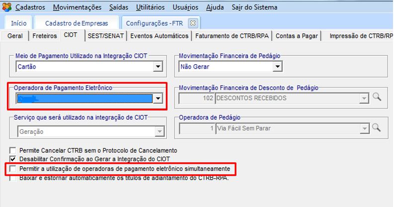 - Para utilizar as informações do menu de Cadastros > Empresas > Freteiros > Geração CIOT > Geral, é necessário desmarcar a opção: Permitir a utilização de operadoras de pagamento eletrônico simultaneamente.