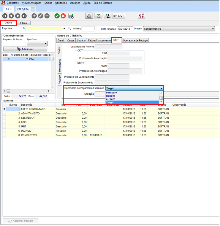 Na Guia CIOT o campo Operadora de Pagamento Eletrônico deve estar habilitado para que possa selecionar a utilizada pela sua empresa.
