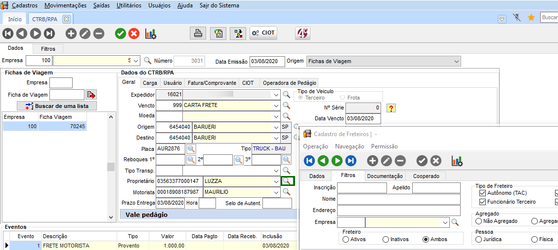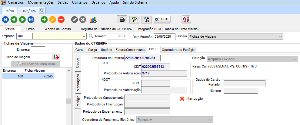 No módulo FTR, em Movimentações > CTRB/RPA > Emissão, localizar um CTRB que já tenha dados de CIOT autorizados.