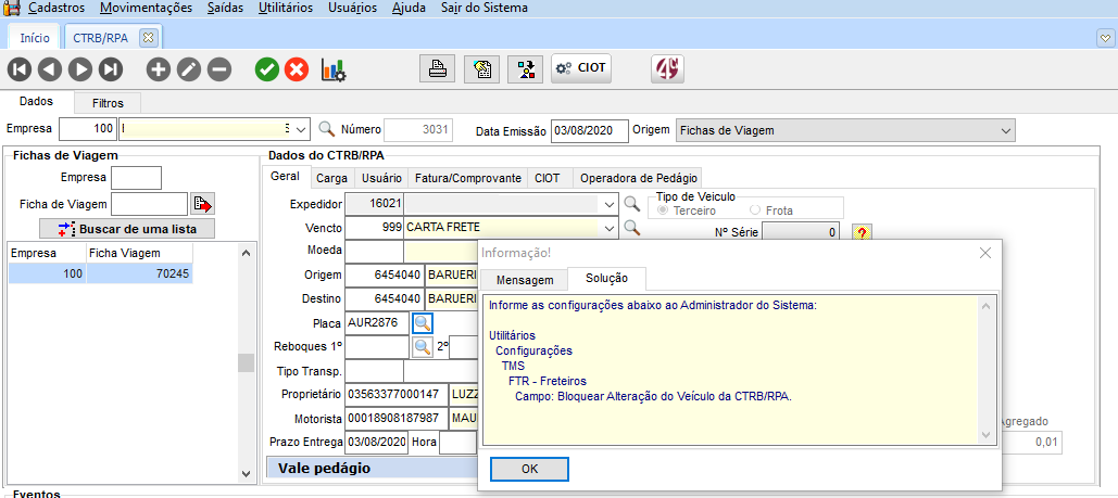 Nas configurações gerais do módulo FTR, deve estar configuração para bloquear os dados do veículo no CTRB/RPA, e quando a configuração estiver marcada, o sistema verifica se CTRB/RPA já tem CIOT gerado, se sim, não permite realizar alteração no campo Veículo, e consequentemente no campo Motorista também. Desta forma o sistema auxilia para que não haja erros no processo de pagamento entre a informação do CIOT e do CTRB/RPA.