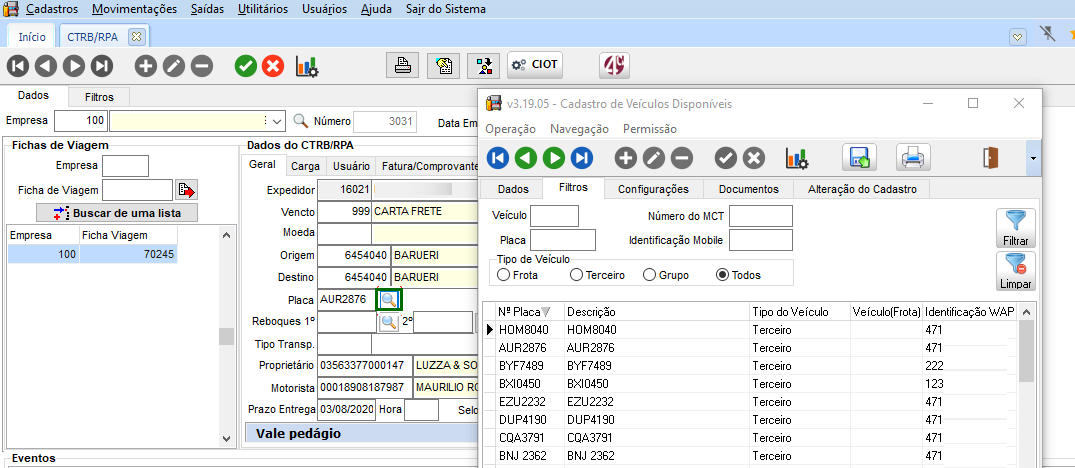 Utilizado o mesmo exemplo anterior, com o CTRB/RPA com dados do CIOT. Com isso, o sistema permite realizar a pesquisa de novos registros nos campos Veículo, Proprietário e Motorista.